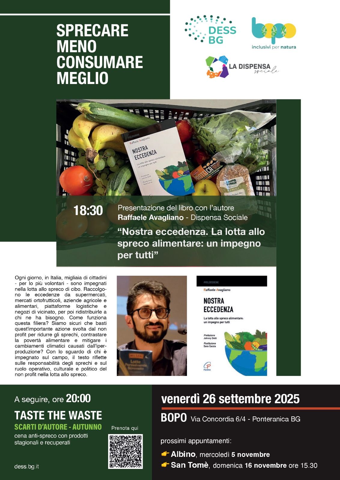 La cena è preceduta, alle 18,30, dalla prima presentazione del libro di Raffaele Avagliano "Nostra eccedenza - La lotta allo spreco alimentare, un impegno per tutti". Vai all'evento.